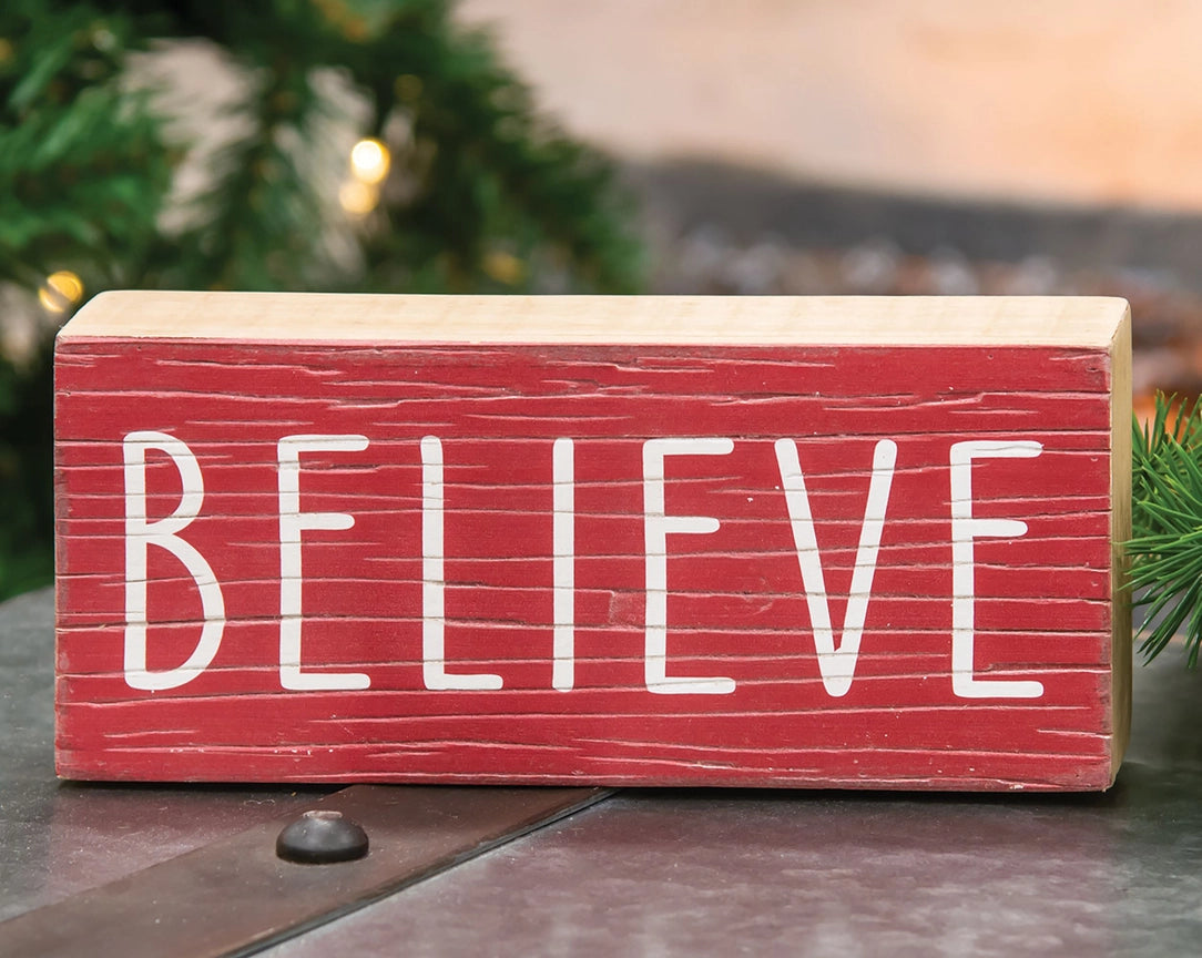 Believe Wooden Sign is a wood block sign that can be displayed on a table or shelf, or hung on the wall via a sawtooth hanger. The red painted sign features the word, "Believe," in white lettering for a festive design. Measures 3.5" high by 8" wide and 1.5" deep.