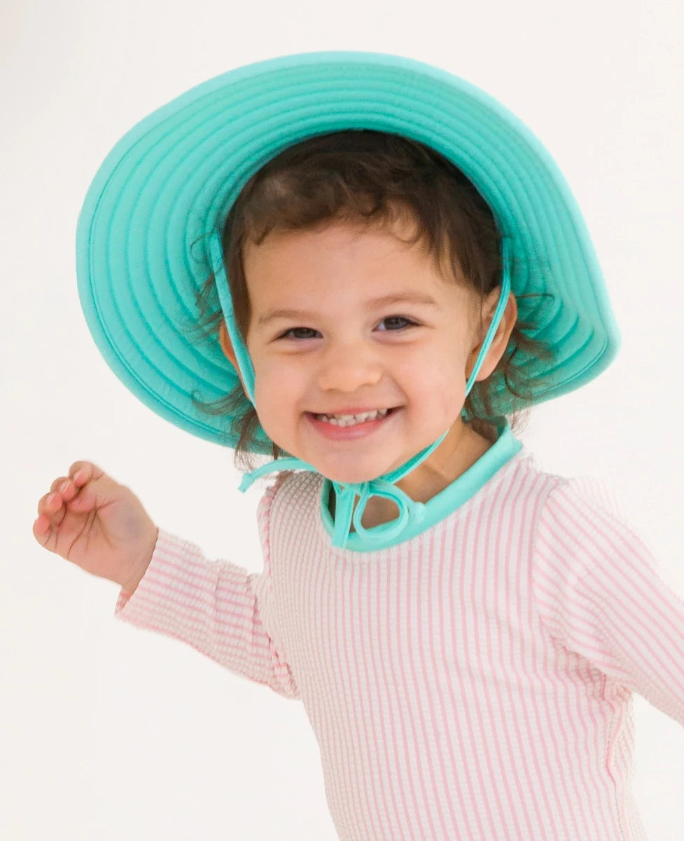 This ultra girly toddler swim hat has built in UPF 50+ sun protection to keep your baby girl extra safe from the sun's harmful rays. All sizes feature functional ties and can be styled two ways: tied under the chin to ensure a snug fit or tucked up through the brim and tied in the back in a fun bow!