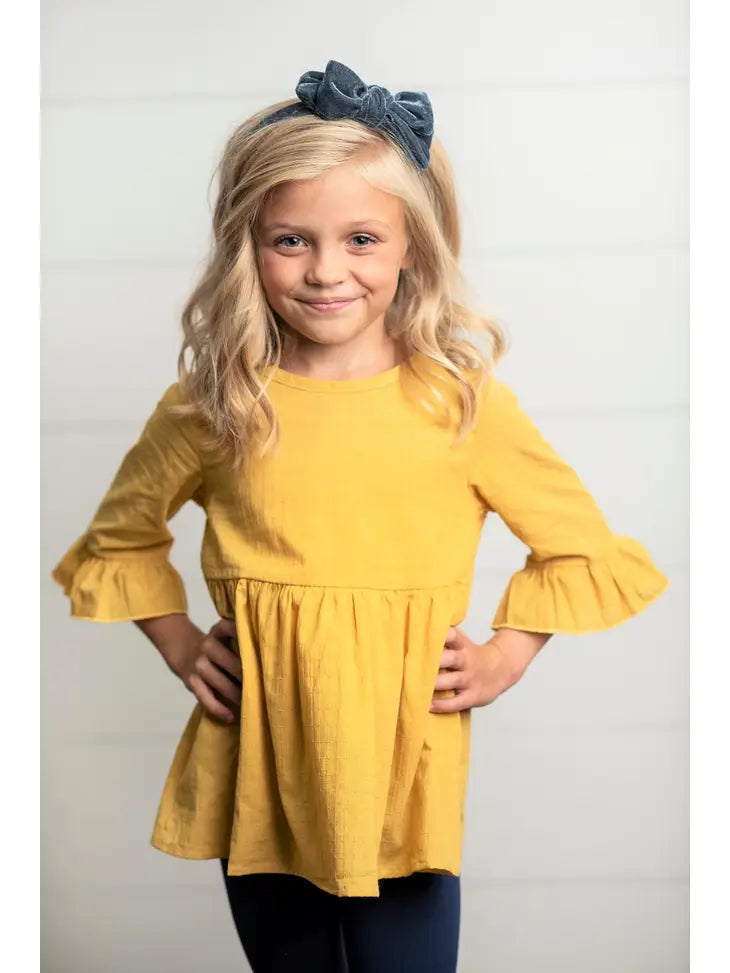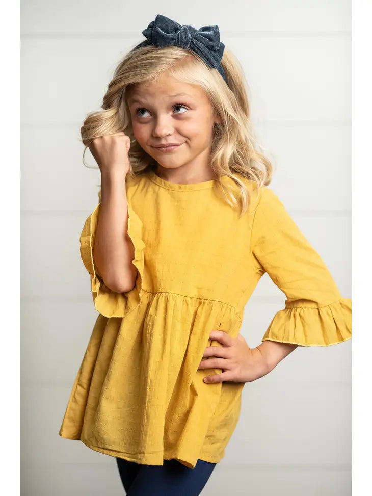 This 3/4 Length Sleeve Mustard Top with Ruffles from Adorable Sweetness is the perfect blend of chic style and everyday comfort. This versatile top is a must-have addition to any young fashionista's wardrobe. It's the perfect combination of elegance, comfort, and versatility that every girl needs!