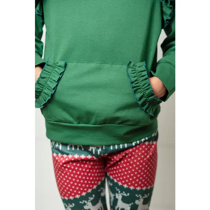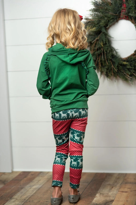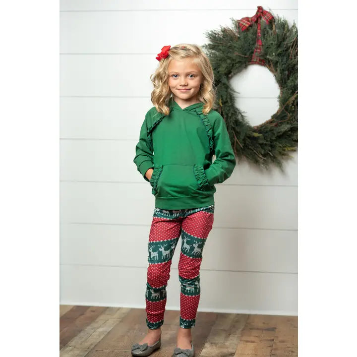 This girls two piece set includes a green ruffle hooded top with front ruffle pocket and Red/green reindeer print leggings. The Perfect outfit for a snuggly Winter Christmas Holiday Season! TOP: 97% Cotton, 3% Spandex BOTTOMS: 95% Polyester, 5% Spandex