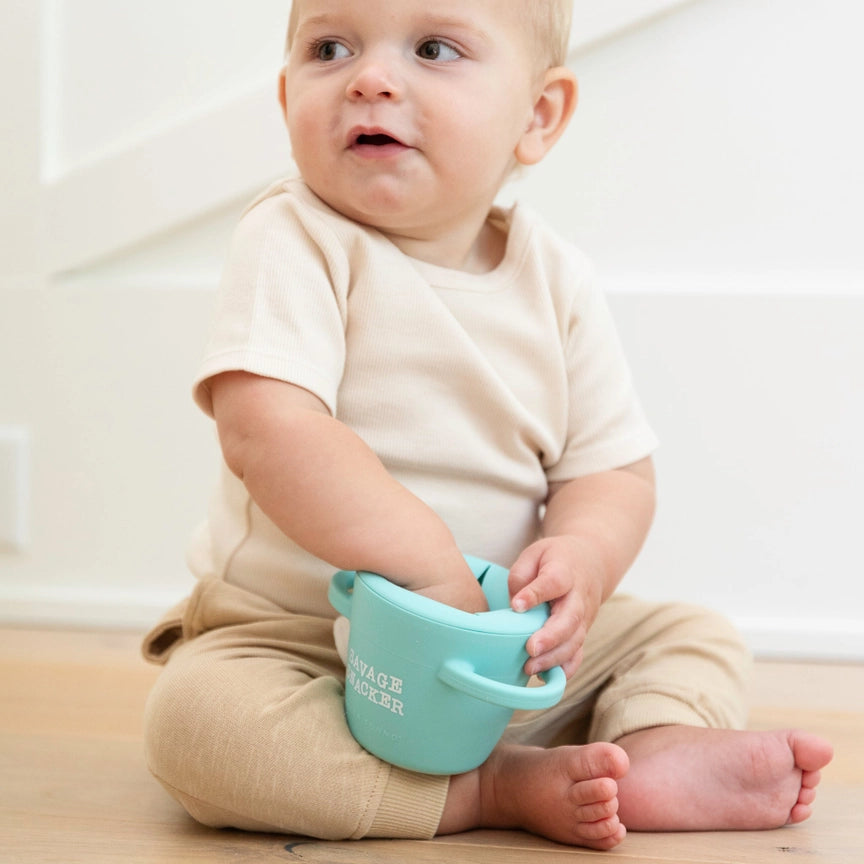 The Happy Snacker is a first-of-its-kind two-piece silicone snack cup with a mess-proof snap-tight lid and soft silicone opening so little hands can easily access food and prevent spills. Designed with easy-grip handles, it fits in car seats and stroller cup holders.