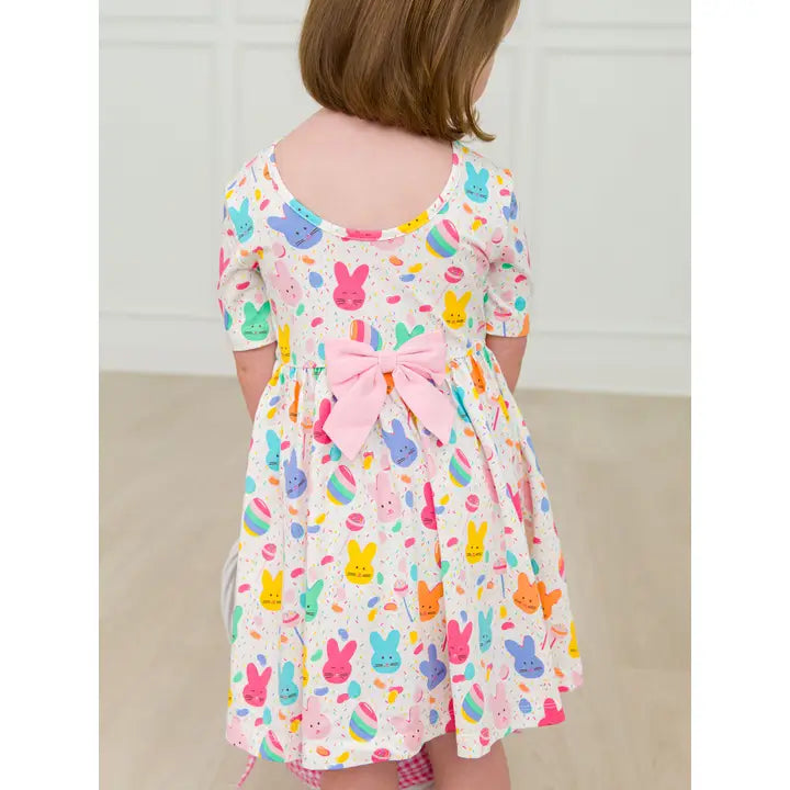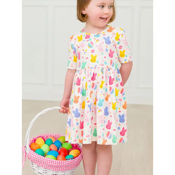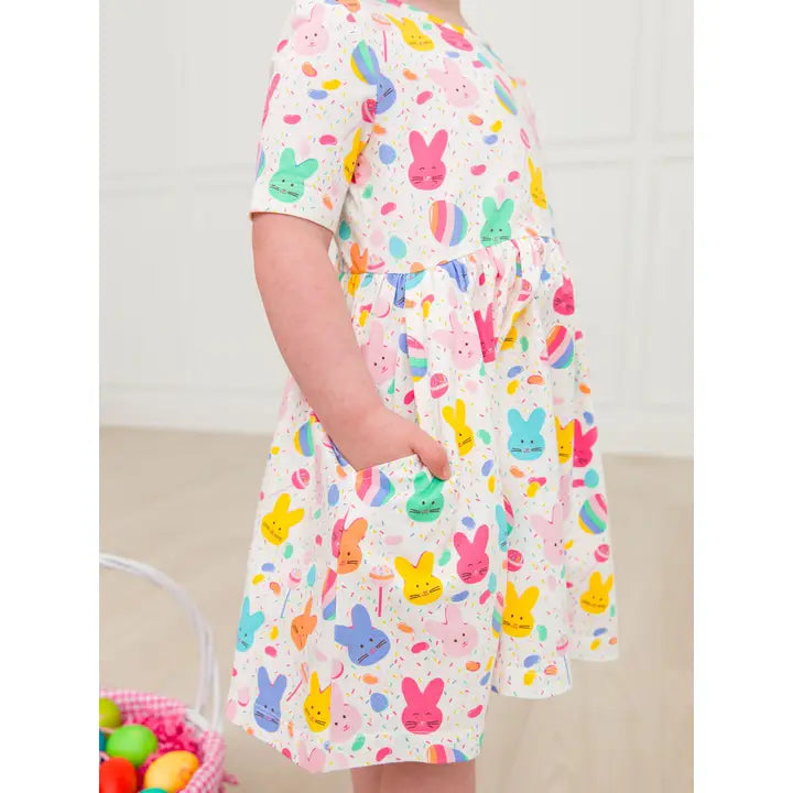 Whatever your day holds, we hope you find time to twirl! Memory making meets casual comfort with our girls' dress, featuring functional pockets and a bow accent. Great for layering with a sweater during transitional weather! Add a monogram for that extra special detail. Candy bunnies, lollipops, and jelly beans are sprinkled across this sweet Easter ready pattern!