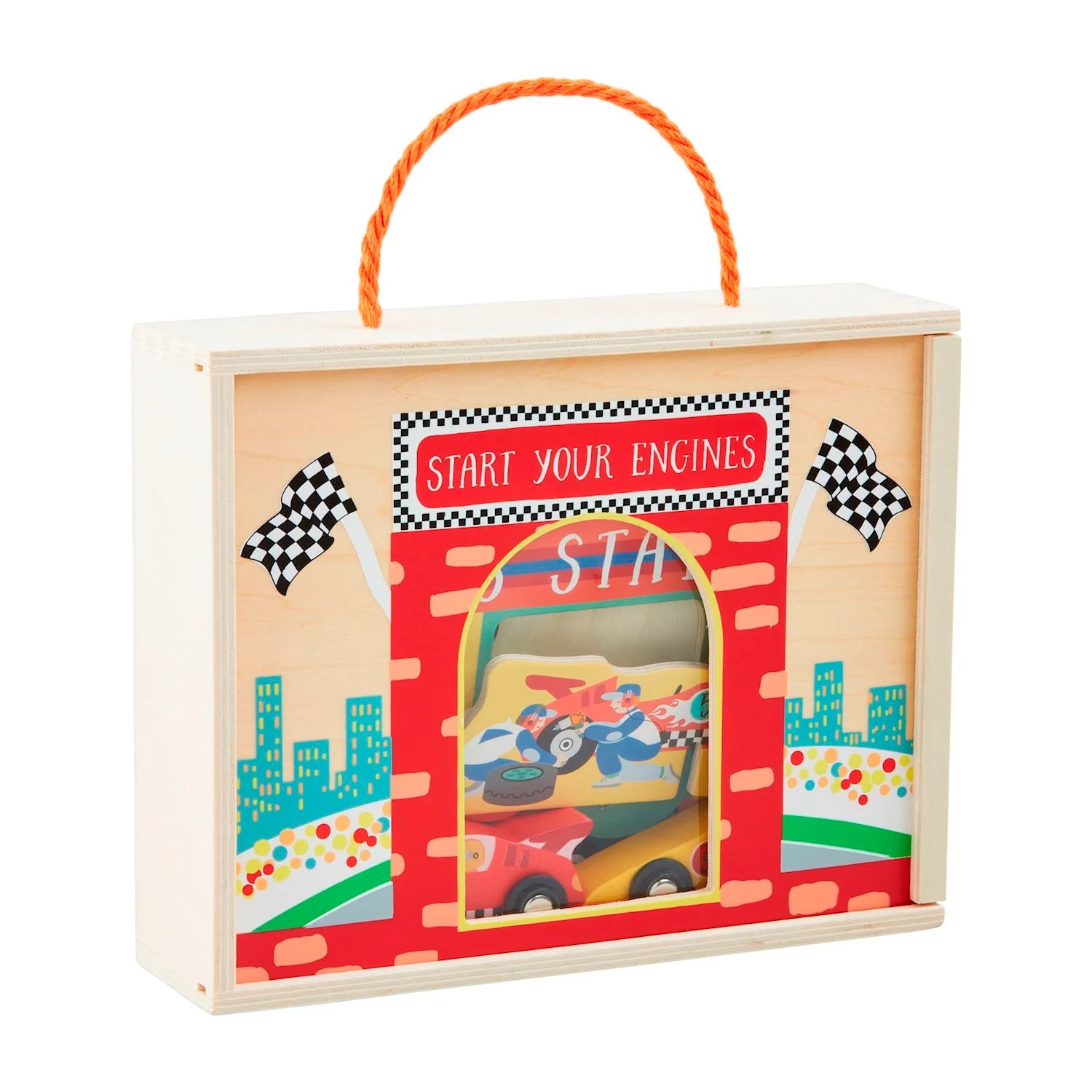 The Race Track Wood Play Set is a comprehensive 12-piece set that guarantees hours of fun and excitement for children. This boxed wood race track set includes everything needed to create an immersive racing experience. With three rolling race cars included, kids can engage in thrilling races and compete against their friends. The race track itself is thoughtfully designed to provide a challenging and dynamic course, ensuring endless entertainment.